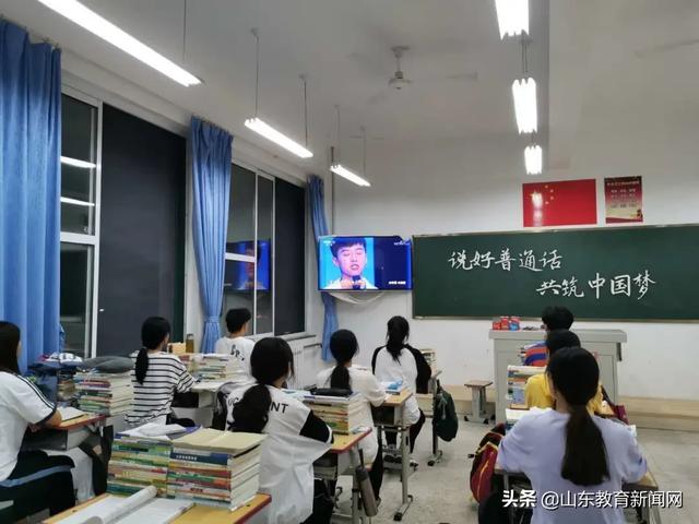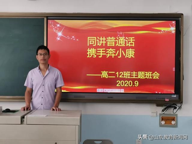 牟平一中在三个年级和新疆部分别举行了普通话推广活动。在教学楼和宿舍楼各楼层及宣传栏均张贴“请讲普通话,请写规范字”“同讲普通话,携手进小康”的标语;每个班级利用班会时间开展推广普通话主题班会;在新疆部开展了“语同音、人同心,同心向党”主题诗歌朗诵活动等。