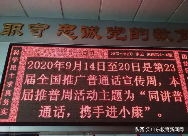 金秋九月,又逢一年一度的推普周活动,今年的9月14日至20日为第23届全国推广普通话宣传周,本届推普周的主题是:“同讲普通话,携手进小康”。烟台各级各类学校围绕主题,加大宣传力度,通过国旗下讲话、黑板报、宣传标语等途径,共同营造一个良好的语言环境。