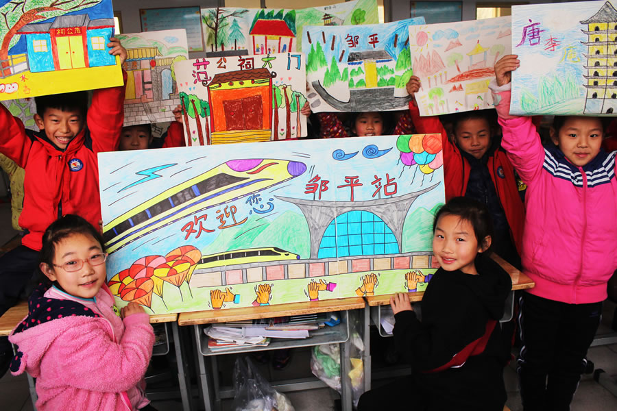 济青高铁于2018年12月26日正式通车。为庆祝通车,地处途经站点附近的邹平市长山镇范公小学的师生用彩笔在旧挂历上精心绘出家乡改革开放40年的喜人变化。图为学生们在展示自己的作品。