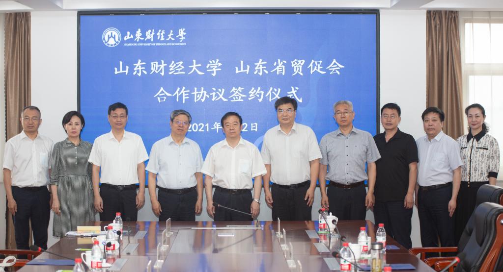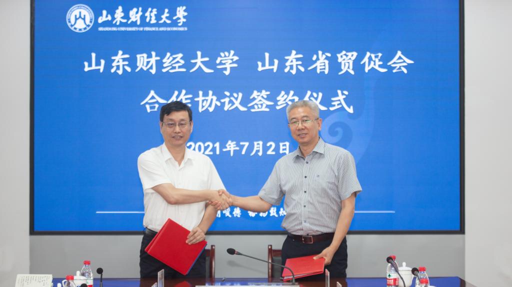 近日,山东财经大学与中国国际贸易促进委员会山东省委员会合作协议签约仪式在燕山校区举行。山东省贸促会党组书记、会长于风贵、副会长贺忠军、秘书长陈彤,学校党委书记王邵军、校长赵忠秀、副校长张新出席签约仪式并进行座谈。王邵军、于风贵致辞,张新、贺忠军分别代表双方签约,赵忠秀主持签约仪式。